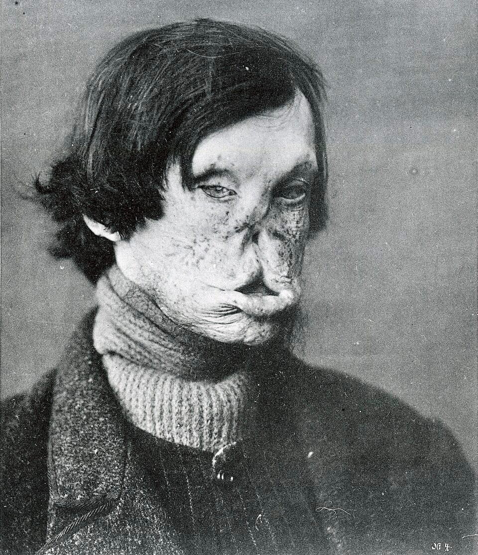 Twarz pacjenta zdeformowana przez trąd (leprosy). Rysunek z XIX w. (źródło: Wikipedia)